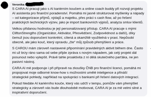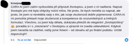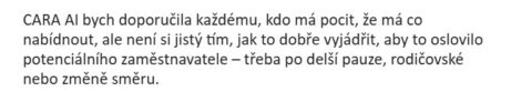 "CARA AI jsem zatím vyzkoušela při přípravě životopisu a jsem z ní nadšená. Napsat životopis pro mě byla vždycky noční můra. Ne proto, že bych neměla co napsat, ale proto, že jsem si nevěděla rady s tím, jak svoje zkušenosti dobře pojmenovat."