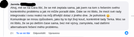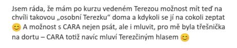 "Mně se na CARA líbí, že se mě zeptala sama, jak jsem na tom s řešením svého konkrétního problému a jak mi může poradit dále. Dále se mi líbilo, že mezi své rady integrovala i svou reakci na můj dřívější dotaz z jiného dne."