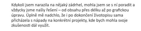 "Kdykoli jsem narazila na nějaký zádrhel, mohla jsem se s ní poradit a vždycky jsme našly řešení – od obsahu přes délku až po grafickou úpravu. Úplně mě nadchlo, že i po dokončení životopisu sama přicházela s nápady na konkrétní projekty, kde bych mohla svoje zkušenosti dál využít."
